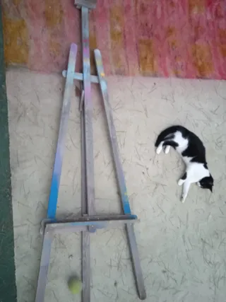 Caballete de madera para lienzos, ideal para artistas. Es plegable y fácil de transportar. - Estructura de madera. - Altura ajustable. - Base estable.