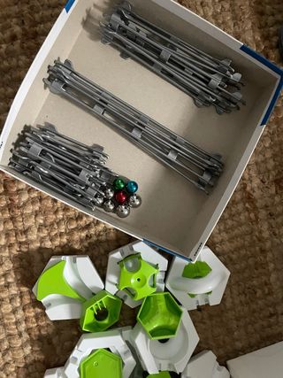 Set completo de Gravitrax, el sistema de pistas interactivo para experimentar la fuerza de la gravedad. - Incluye piezas de construcción y pistas. - Caja original y componentes visibles.