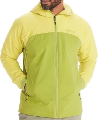 Chaqueta Marmot Novus LT Hybrid en talla M. Diseño bicolor en amarillo y verde. Breathable Water repellent "Recycled 20D stretch nylon" "PrimaLoftu00e Silver Active insulation insulates when wet" Breathable stretch lining for more comfort "Wedge-shaped forearm section and pre-shaped elbow sections for easy mobility" Zippered pockets and interior pocket for secure storage of items "The adjustable drawstring hem keeps cold air out"