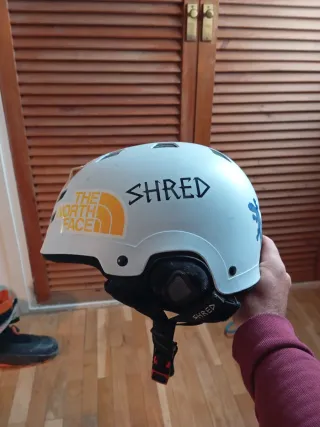 Casco de la marca SHRED, apto para esquí, snowboard y skate. Presenta un diseño blanco con detalles.