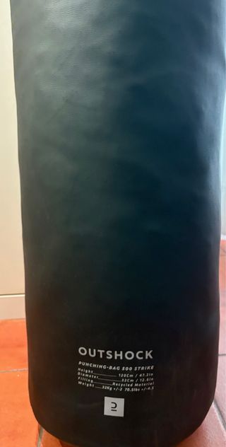 Saco de boxeo Outshock 500 Strike en color negro. Nuevo usado 2 veces. Precio original 110€ - Altura: 120 cm. - Diámetro: 32 cm. - Relleno: Material reciclado. - Peso: 32 kg (+/- 2 kg).