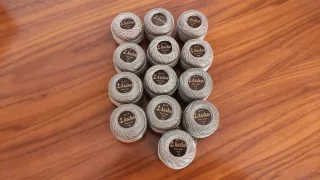 Lote de 12 ovillos de hilo perlé de la marca Anchor, cada uno de 5 gramos. Se incluye un ovillo adicional de regalo. - Hilo perlé de alta calidad. - Color gris plateado. - Peso por ovillo: 5 gramos. - Marca: Anchor.