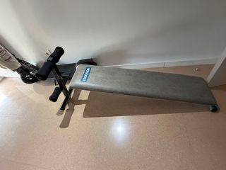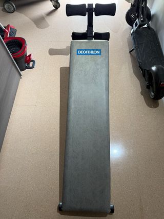 Banco para ejercicios abdominales de la marca Decathlon. Ideal para entrenar en casa. - Estructura metálica. - Acolchado para mayor comodidad. - Diseño plegable para fácil almacenamiento.