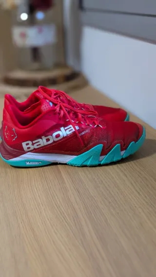 Zapatillas de pádel Babolat Jet Premura 2 Lebron, modelo profesional usado por Juan Lebrón. Talla EU 46 (29,5 cm). Color rojo con suela Michelin turquesa de gran agarre y durabilidad. Muy ligeras, cómodas y estables, ideales para jugadores intensivos. Upper transpirable Matryx Evo, excelente sujeción lateral y gran respuesta en movimientos rápidos. Estado muy bueno, con desgaste normal de uso visible en la parte delantera (ver fotos). La suela aún tiene buena vida útil. Se venden por no usarse. Entrega en mano o envío por Wallapop.