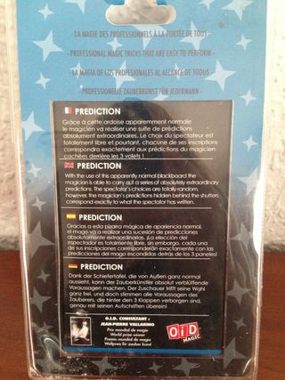 Juego de manos de la marca OID Magic, de muy buena calidad. El mago podrá realizar una serie de predicciones. Instrucciones en español. A partir de 7 años. Nuevo a estrenar y precintado. Medidas de la caja (sin el blister) 15 x 10 cm.