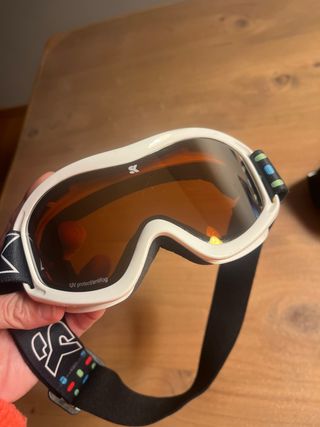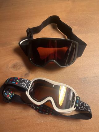 Conjunto de gafas de esquí diseñadas para niños de entre 7 y 12 años. Son ideales para proteger los ojos durante la práctica de deportes de invierno. - Montura negra con lente naranja. - Correa negra ajustable. - Montura blanca con correa de colores y logo. - Protección UV y antivaho.
