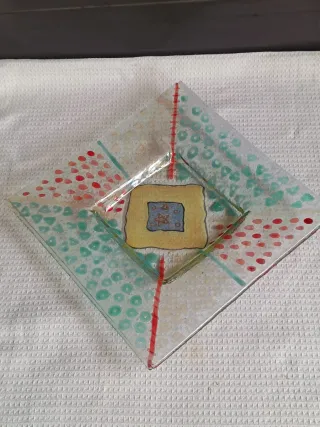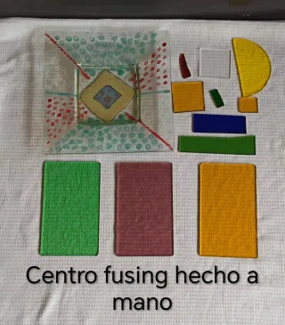 Pieza de centro de fusing hecha a mano, con un diseño único. Incluye tres cristales adicionales. Añado los restos si los quieren. ☑️ Hay 2 más al mismo precio, fotos 8 y 9. - Diseño artístico con detalles en rojo y verde. - Centro decorativo con forma cuadrada. - Tres cristales rectangulares de colores: amarillo, morado y verde.