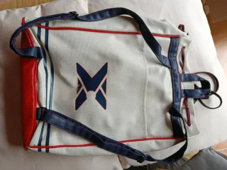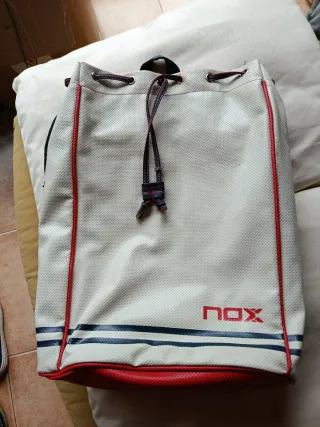 Mochila de la marca NOX. - Color blanco con detalles en rojo y azul marino. - Cierre de cordón ajustable. - Logo de la marca visible. Medida 47 x 42 . Separador Interior y cremallera