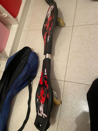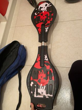 Waveboard con un diseño llamativo en negro, rojo y blanco. Incluye una bolsa de transporte azul para facilitar su traslado. - Diseño con estampado de calaveras - Ruedas amarillas. - Eje metálico central.