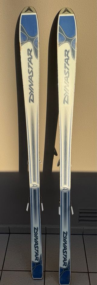 Conjunto de esquís Dynastar para carving con fijaciones Salomon. - Longitud de 170 cm. - Diseño en tonos crema y azul. - Fijaciones Salomon incluidas.