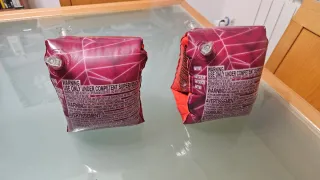Set de dos mangitos de natación DELPHÍN para niños. Totalmente homologados. Ayudan a la flotabilidad y seguridad en el agua. Se pueden separar o unir en función del peso y habilidad del niño. Se han usado solo un par de beces porque mi hija no ha querido llevarlos. Estan en perfecto estado, unicamente llevan escrito el nombre en el perfil. Incluye bolsa de rejilla transporte. - Color amarillo, verde y rojo. - Caracteristicas en las últimas fotos.