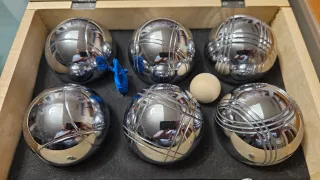 Set de seis bolas de petanca metálicas, perfectas para jugar. - Material: Metal cromado. - Diseño con líneas grabadas. - Incluye una bola pequeña de madera (jack). - Viene en una caja de madera.