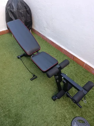 Banco de pesas con diseño moderno y acolchado para mayor comodidad. - Estructura metálica robusta. - Tapicería negra con ribete rojo. - Acolchado en pies y respaldo. Lo compré pero sólo lo he usado un dia 30m😅 No es plegable. Todo junto 95€ sin las pesas 75€. POR SU DIMENSIÓN NO HAGO ENVÍO, RECOGIDA EN MANO