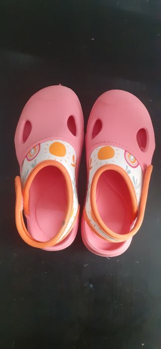 Chancletas de piscina para niña en talla 28/29. Son de color rosa con un diseño divertido de arcoíris y sol. - Color: Rosa. - Diseño: Arcoíris y sol. - Talla: 28/29.