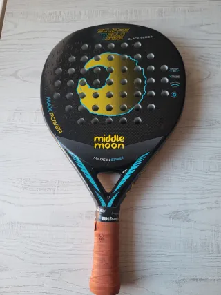 Pala de pádel Middle Moon Eclipse Gold Attack, Black Series. - Diseño con acabado en negro y detalles en amarillo y azul. - Fabricada en España.