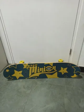 Skate del Decathlon con dibujo de perro verde. Tiene algunas pegatinas de caras que se quitan fàcilmente.