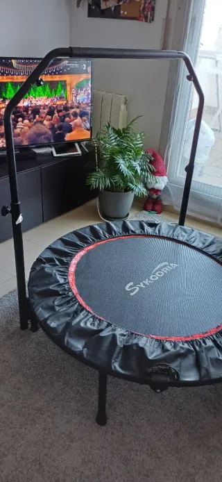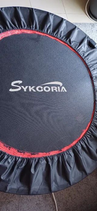 Colchoneta de fitness Sykooria con barra de apoyo. - Diseño redondo y compacto. - Barra de sujeción ajustable en altura. - Superficie de salto negra con borde rojo. Ideal para hacer ejercicios sin impacto, al botar. Perfecto para recuperación de lesiones y para niños. Muy poco uso, siempre en el interior. Como nuevo.