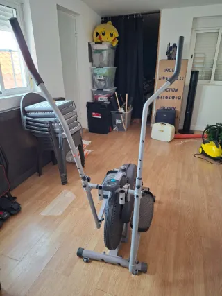 Bicicleta elíptica de color gris, ideal para entrenamientos en casa. - Diseño compacto. - Pedales antideslizantes. - Manillar ergonómico. Esta un poco manchada con spray de color rosa (tercera foto)
