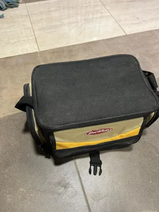 Maleta de pesca de la marca Berkeley, ideal para llevar tus señuelos y equipo. - Color negro y beige con detalles amarillos. - Compartimento principal con cremallera. - Bolsillo frontal con cierre de clip. - Correa ajustable para el hombro. -Mas de 60 señuelos de calidad