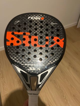 Pala de pádel Siux Fenix 3. - Diseño con acabado en carbono. - Detalles en color naranja. - Superficie con agujeros. - Logo de Siux en la parte inferior.