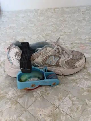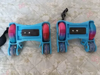 Ruedas para acoplar a zapatillas deportivas. Son de color azul y tienen un diseño divertido. - Ruedas de colores. - Correa ajustable negra.