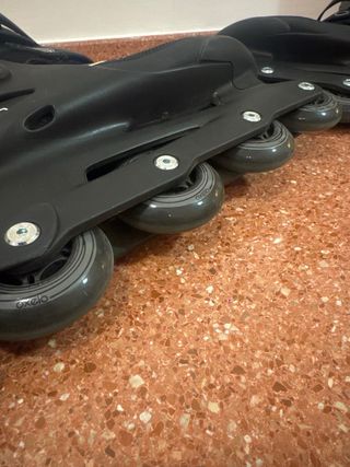 Patines en línea Oxelo en color negro, talla 42.5. Han sido usados una sola vez. - Diseño en negro con detalles blancos. - Cierre con velcro y hebilla.