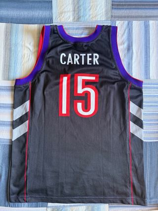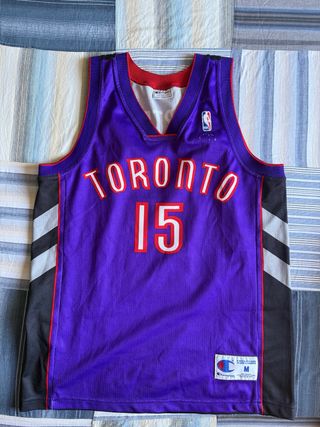 Camiseta de baloncesto Champion de los Toronto Raptors, talla M. Con el número 15 y el nombre de Vince Carter. - Color morado. - Diseño con detalles en negro y gris en los laterales. - Logo de la NBA y Champion. - Cuello y sisas con ribete rojo.