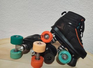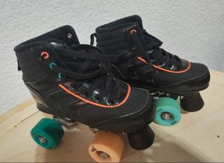 Patines de cuatro ruedas en color negro, con detalles en naranja y turquesa. Están prácticamente nuevos. Incluye una funda para guardarlos. - Patines de bota alta. - Ruedas de colores. - Incluye funda protectora.