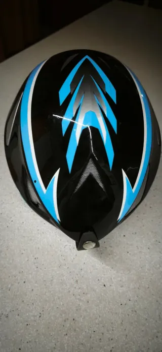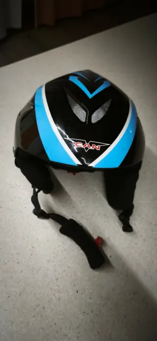 Casco de esquí para niños con un diseño moderno y llamativo. - Color negro con detalles en azul y blanco. - Cierre de seguridad. - Orejeras acolchadas. Talla s 55-56