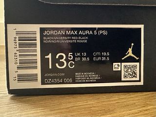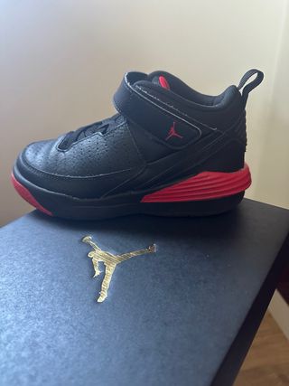 Zapatillas Jordan Max Aura en color negro y rojo. Impecables, como nuevas. - Cierre de velcro. - Detalle del logo Jumpman. - Suela de goma.