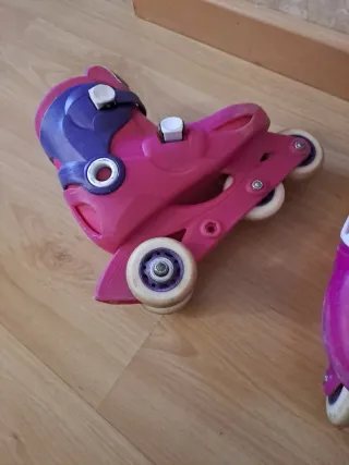 Patines en línea de color rosa y morado, ideales para niños. - Marca Oxelo. - Talla ajustable. - Cierre de velcro y hebilla. Con signos de estar usados.Talla ajustable 30 a 32