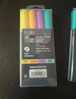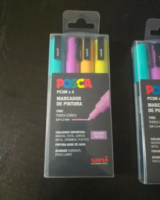 1 x 6€ 2 x 5€ cada uno Pack de 4 rotuladores Posca PC3M con punta cónica fina. NUEVOS SIN ABRIR. - Colores pastel. - Punta de 0,9-1,3 mm. - Aptos para múltiples superficies: madera, textil, cartón, metal, cerámica, plástico. - Pintura a base de agua. - Acabado cubriente, opaco y mate.