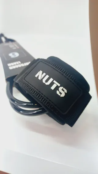 Leash para tabla de surf de la marca NUTS. Diseñado para ofrecer seguridad y comodidad. - Correa de velcro ajustable. - Cuerda negra en espiral.