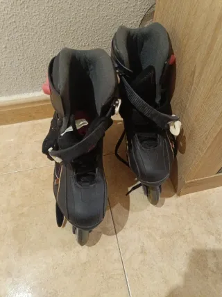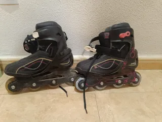 Patines en línea Oxelo en color negro, talla 41. - Diseño deportivo con detalles en rosa y dorado. - Cierre de velcro y hebilla para un ajuste seguro. - Ruedas de poliuretano.