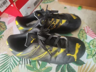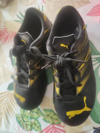 Se las compré a mi hijo en septiembre y en noviembre dijo que no quería seguir jugando al fútbol. solo las usó en 4 partidos que estuvo más tiempo en el banquillo que jugando. Botas de fútbol Puma para niño en talla 32. Diseñadas para césped artificial o natural. - Color negro con detalles en amarillo. - Cierre con cordones. - Logo de Puma en los laterales.