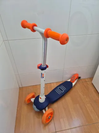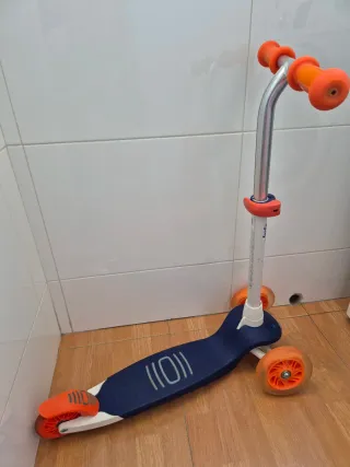 Patinete infantil de tres ruedas, ideal para los más pequeños. Diseñado para ofrecer estabilidad y diversión. Modelo B1 500 Oxelo de Decathlon. - Manillar ajustable en altura. - Ruedas de color naranja. - Plataforma antideslizante de color azul oscuro. - Ruedas delanteras con luces led de colores. - Freno trasero. - Se desmonta fácilmente para ocupar menor espacio. Poco uso, buen estado.