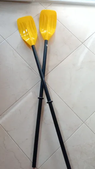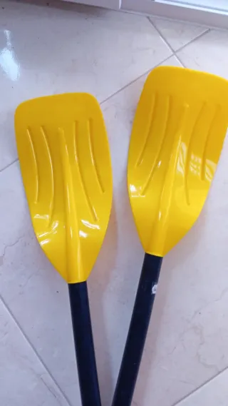 Par de palas amarillas para actividades acuáticas. - Color: Amarillo. - Material: Plástico resistente. - Diseño ergonómico. Se pueden desmontar en 3 partes