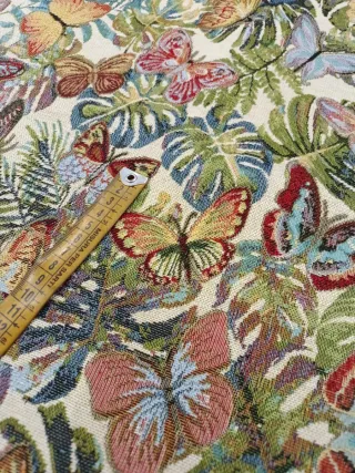 Retal de gobelino con un diseño vibrante de mariposas y hojas tropicales. Ideal para tapicería, decoración o manualidades. El retal mide 1,40m de ancho por 0,55m de alto - Tejido resistente y duradero. - Estampado detallado de mariposas y follaje. - Tonos coloridos y alegres.
