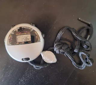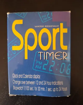 Cronómetro deportivo digital con pantalla LCD y correa. Está nuevo aunque la caja se vea algo rozada, pero se ve que tiene el plástico, solo abierto para probar que funciona. Lleva una pila pequeña de botón, que se incluye.
