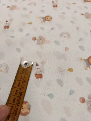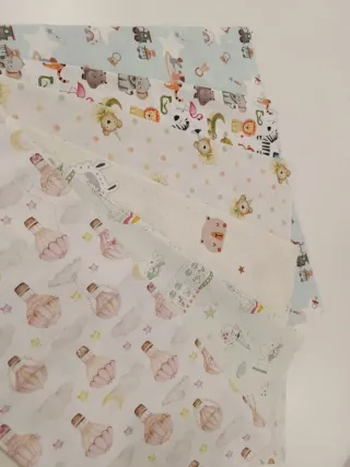 Lote de retales de tela de popelín con estampados infantiles. Juguetes 0,70m X 0,46m Animales 0,70m X 0,48m Payasos 0,70m X 0,49m Animales 0,70m X 0,75m Trenes 0,70m X 0,74m Globos 0,70m X 0,48m - Diseños variados con animales, globos y nubes. - Ideal para manualidades y proyectos de costura.
