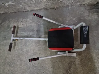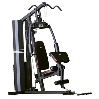 Multiestación de la marca Adidas, ideal para entrenar en casa. - Diseño robusto y compacto. - Tapicería negra con detalles en rojo. - Estructura de acero.
