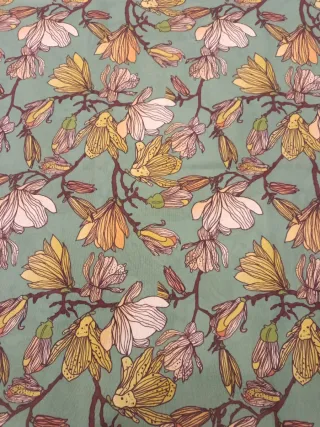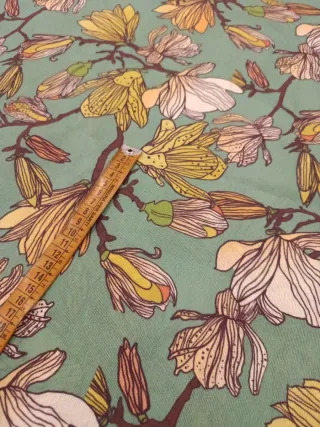 Retal de loneta con un bonito estampado floral. El retal mide 1,40m de ancho por 1m de alto - Diseño con flores en tonos amarillos, blancos y naranjas. - Fondo verde agua. - Ideal para proyectos de costura y decoración.
