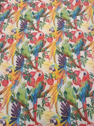 Retal de loneta con un vibrante estampado de loros y frutas, ideal para proyectos de costura y decoración. El retal mide 1m de ancho por 1,40m de alto - Diseño colorido con loros y granadas. - Tejido resistente y versátil. - Estilo artístico y tropical.