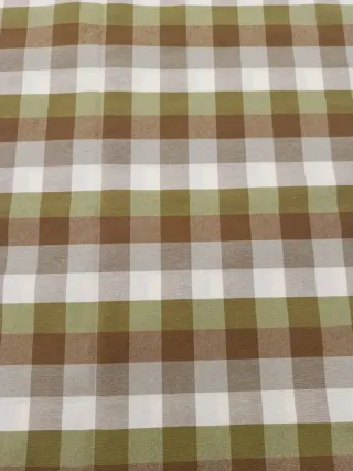 Retal de loneta con estampado Vichy en tonos marrón y verde. Ideal para proyectos de costura y manualidades. El retal mide 1,40m de ancho por 1m de alto - Diseño a cuadros Vichy. - Colores: marrón y verde.