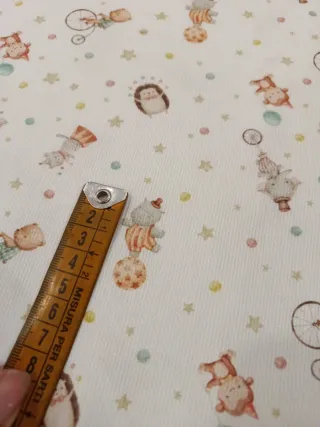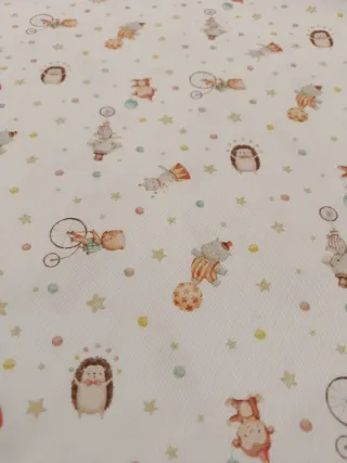 Retal de tela piqué con estampado infantil con fondo gris muy clarito El retal mide 0,80m de ancho por 1m de alto - Diseño con animales del circo y estrellas. - Ideal para proyectos de costura y manualidades.