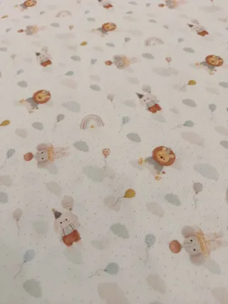 Retal de tela piqué con estampado infantil con fondo blanco. El retal mide 0,80m de ancho por 1m de alto - Diseño con leones, conejos, arcoíris y globos. - Ideal para proyectos de costura y manualidades.