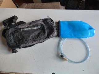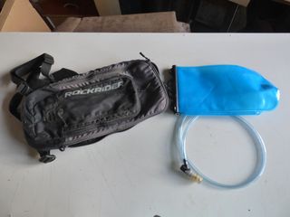 Mochila de hidratación Rockrider con bolsa de agua. -Apenas se ha utilizado - Mochila de color gris con logo Rockrider. - Bolsa de hidratación azul. - Tubo de agua con boquilla.