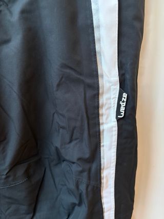 Pantalón de nieve Decathlon en color negro. Diseñado para actividades en la montaña. - Paneles laterales blancos. - Cierre de cremallera y botones. - Cintura ajustable con velcro. - Detalle de líneas rojas y blancas en los bajos.