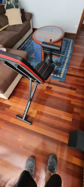 Banco de musculación de la marca MB, diseñado para entrenamientos en casa. - Tapicería acolchada en negro con detalles en rojo. - Estructura metálica robusta. - Reposapiés para mayor estabilidad. -Plegable