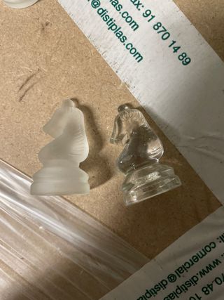 Set de piezas de ajedrez de cristal, con un diseño elegante y transparente. - Material: Cristal. - Acabado: Transparente y esmerilado.